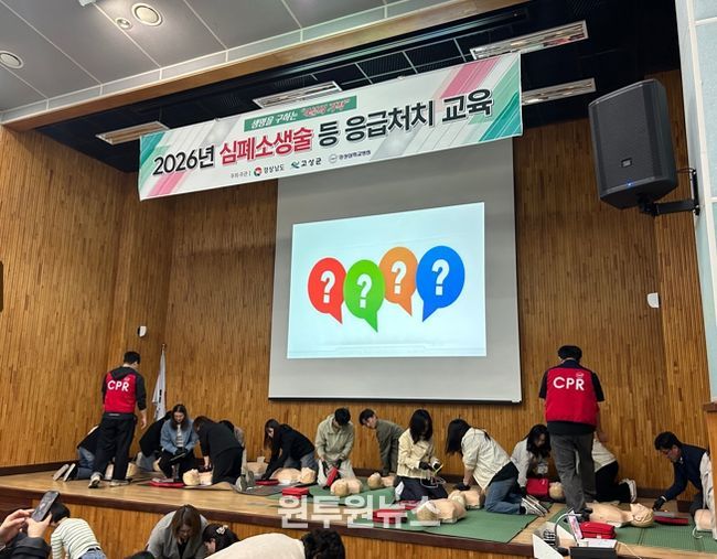 (원투원뉴스) 고성군은 4월 23일부터 24일까지 이틀간 고성군농업기술센터 2층 친환경농업연구소 강당에서 법정의무교육대상자 등 100여 명을 대상으로 ‘2026년 심폐소생술 등 응급처치 교육’을 실시했다.