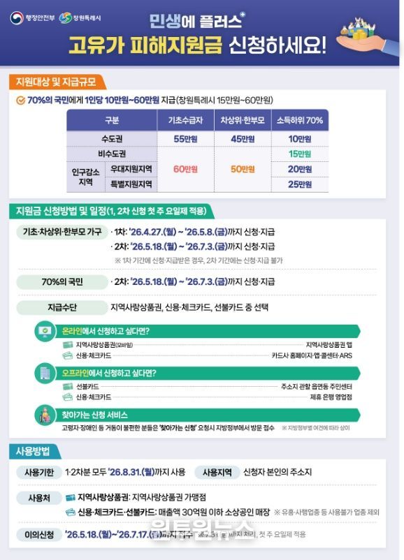 한편, 오는 5월 18일부터 7월 3일까지는 1차 지급대상을 제외한 소득 하위 70% 시민을 대상으로 2차 지원금의 신청·지급이 이어진다. 건강보험료를 활용한 세부 선정 기준(컷오프) 등 구체적인 사항은 5월 중 행정안전부의 별도 지침이 마련되는 대로 확정·안내할 예정이다.
