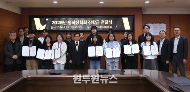 (원투원뉴스) 재단법인 명학장학회는 2026년 4월 23일 한국영상대학교를 시작으로 ‘2026년도 장학금 전달식’을 개최하고 지역 인재 육성과 학생들의 자발적인 동아리 활동 등을 지원하기 위한 장학금 약 8천3백만원을 전달했다.