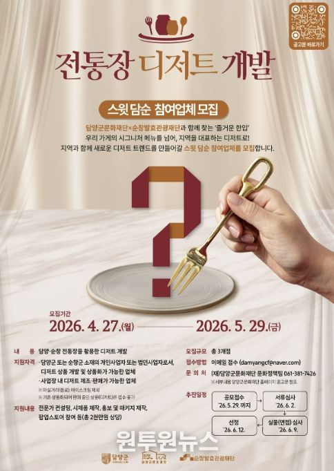(원투원뉴스) 담양군문화재단이 순창발효관광재단과 함께 지역 전통장을 활용한 디저트 개발 프로젝트 ‘스윗 담순’ 참여업체를 모집한다.