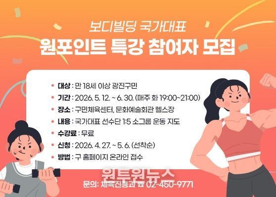 (원투원뉴스) 광진구가 구민의 건강한 여가생활과 생활체육 활성화를 위해 ‘국가대표와 함께하는 원포인트 특강’을 운영한다.