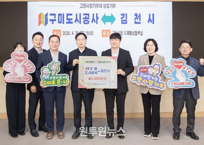 (원투원뉴스) 구미시는 4월 28일 구미도시공사와 김천시가 고향사랑기부제 활성화와 이웃 지역 간 상생 발전을 위해 고향사랑기부금 2,000만원을 상호기부했다고 밝혔다.