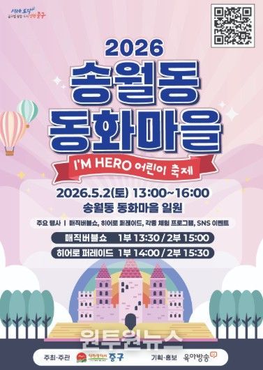 (원투원뉴스) 인천시 중구는 어린이날을 맞아 오는 5월 2일 ‘2026년 송월동 동화마을 어린이 축제’를 개최한다고 밝혔다.
