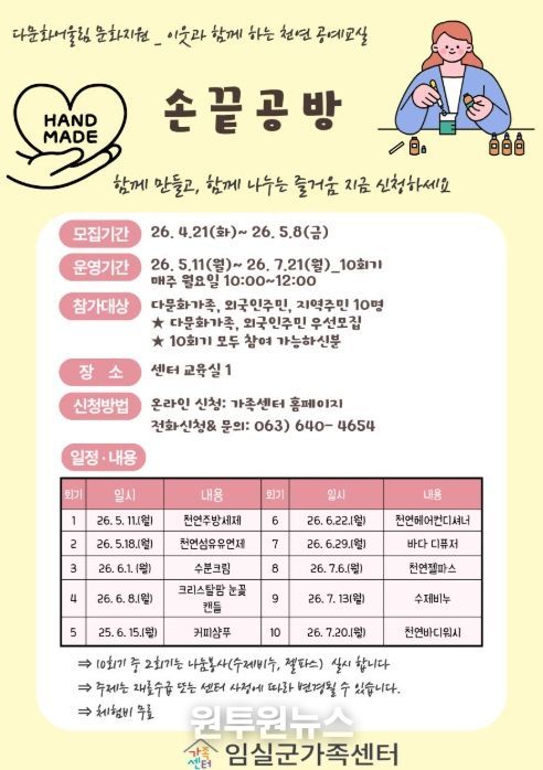 (원투원뉴스) 임실군 가족센터는 다문화가족·외국인주민·지역주민이 함께 천연 생활용품을 만들고 나누며 이웃 간 따뜻한 소통과 어울림을 경험할 수 있는 천연공예 프로그램 '손끝공방' 참여자를 모집한다.