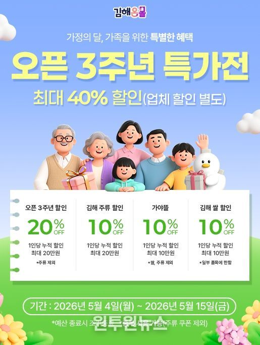 (원투원뉴스) 김해의생명·산업진흥원은 김해시 통합 온라인 쇼핑몰 ‘김해온몰’ 오픈 3주년과 5월 가정의 달을 맞아 파격 특가전을 진행한다고 밝혔다.