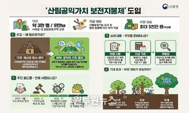 ‘산림보전지불제’는 산주가 시‧도지사와 산림보호 협약을 체결 후 산림보호구역의 공익기능 유지‧증진을 위한 활동에 참여하면 그 비용을 ‘산림공익가치 보전지불금’으로 지급 받을 수 있는 지원체계로, 2027년부터 관련 예산을 확보해 시범사업*을 추진하고 점차 확대할 계획이다.