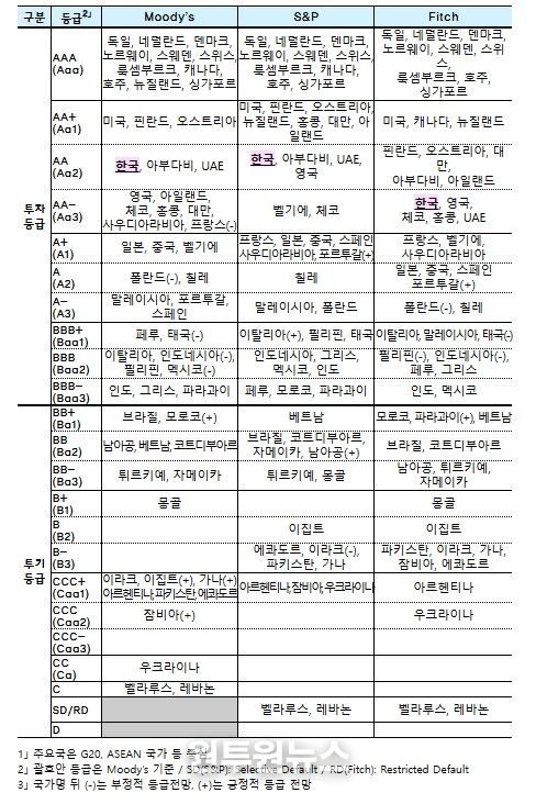 (원투원뉴스) 국제 신용평가사 S&P는 4.29일 한국의 국가신용등급 및 전망을 ‘AA, 안정적’으로 유지한다고 발표했다. S&P는 중동 분쟁에 따른 글로벌 에너지 시장의 불안이 ’26년 한국 경제의 위험 요소이나, 반도체 등 산업 부문의 경쟁력과 재정정책이 이러한 부담을 완화할 것이라고 전망했다. 또한, 향후 3~4년 동안 대부분의 고소득 국가들보다는 높은 평균 성장률을 유지할 것으로 예상했다.