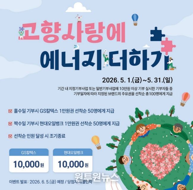(원투원뉴스) 원주시는 고향사랑기부제 활성화를 위해 5월 한 달간 특별 이벤트 ‘고향사랑에 에너지 더하기’를 추진한다.