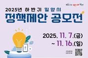 (원투원뉴스) 경남 밀양시는 시민의 창의적인 아이디어를 시정에 반영하기 위해 오는 7일부터 16일까지 ‘2025년 하반기 정책제안 공모전’을 실시한다고 밝혔다. 이번 공모전은 △인구, 청년 △지역경제, 일자리, 산업 △문화, 관광 △보건, 복지 △주거, 안전, 환경 △농업, 기타 등 6개 분야로 나눠 진행되며, 밀양 시정에 관심 있는 국민 누구나 참여할 수 있다. 시는 이번 공모를 통해 시민과의 소통을 강화하고, 정책 수립 과정에 시민 참여를 확대해 실제 시정에 반영할 수 있는 창의적이고 현실적인 아이디어를 적극 발굴할 계획이다. 참여 방법은 국민권익위가 운영하는 국민생각함 또는 시 정책공모 담당자 이메일로 제출하면 되며, 우편 및 방문 접수(밀양시 밀양대로 2047, 밀양시청 5층 인구정책담당관실)도 가능하다. 접수된 제안은 △실시 가능성 △창의성 △효율성 △적용 범위 △계속성 등을 기준으로 담당 부서의 1차 내부 심사, 외부 전문가가 참여하는 2차 우수제안심사위원회 심사를 거쳐 최대 17건의 우수 제안이 선정된다. 선정된 제안에는 금상 1명(100만원), 은상 2명(각 50만원),