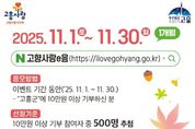 (원투원뉴스) 고흥군은 유자향이 가득한 11월을 맞아 고향사랑기부제 참여자에게 감사의 마음을 전하기 위해 ‘고흥애(愛) 연말정산 이벤트’를 11월 30일까지 운영한다고 밝혔다. 이번 이벤트는 연말정산 시즌을 앞두고 기부자들의 관심이 높아지는 시기에 맞춰 마련된 것으로, 기간 내 고흥군에 10만 원 이상 기부한 참여자 중 500명을 무작위로 추첨해 다이소 모바일 상품권(1만 원권)을 증정한다. 군은 이번 행사를 통해 연말정산 시 세액공제 혜택(10만 원 전액, 초과분 16.5%)을 다시 한번 알리고, 고흥의 대표 농수특산물 답례품을 함께 홍보할 계획이다. 답례품으로는 ▲2025년산 햅쌀 ▲향기로운 유자 제품 ▲김 ▲고흥 한우 ▲나로도 삼치회 등 청정 고흥을 대표하는 품목이 인기를 끌고 있다. 특히 11월에는 고흥유자축제(11.6.~9.)와 연계한 현장 홍보를 강화해 향우와 관광객을 대상으로 기부 참여를 독려할 예정이다. 군 행정과 관계자는 “고흥의 유자향처럼 따뜻한 마음이 전국으로 퍼져나가길 바란다”며 “기부금은 아동·청소년 복지, 문화·의료 인프라 확충 등 군민의 삶의 질 향상에 소중히