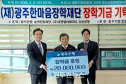 (원투원뉴스) 광주은행은 4일, 광주지방검찰청에서 강지훈 광주은행 영업1본부 부행장과 김종우 광주지방검찰청 검사장, 한상원 광주한마음장학재단 이사장이 참석한 가운데, (재)광주한마음장학재단에 장학금 2천만 원을 전달했다고 밝혔다. 이날 전달된 장학금은 지역사회 범죄 예방을 위한 사업의 일환으로, 검찰 선도 조건부 기소유예 대상 청소년과 생계가 어려운 모범 청소년들의 학업 지원에 사용될 예정이다. 아울러 북한이탈주민 자녀와 다문화가정 자녀 등 사회적 배려가 필요한 청소년들에게도 장학금이 지원된다. 광주은행은 지난 2018년부터 매년 2천만 원 상당의 장학금을 지속적으로 전달해오고 있으며, 올해까지 누적 지원금액은 총 1억 8천만 원에 달한다. 이를 통해 어려운 환경 속에서도 희망을 잃지 않고 꿈을 향해 나아가는 지역 청소년들을 꾸준히 응원하고 있다. 한편, 광주은행은 지역인재 양성을 위한 사회공헌활동을 지속적으로 추진해오고 있다. (재)광주은행장학회를 통해 지금까지 4천8백여 명의 지역 장학생에게 누적 40억 3천만 원 상당의 장학금을 지원했으며, ‘희망이 꽃피는 공부방’(현재 177호점), ‘희망이 꽃피는 꿈나
