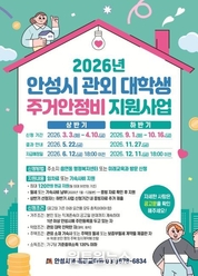(원투원뉴스) 안성시는 관외 대학에 진학한 지역 출신 대학생들의 주거비 부담을 덜어주기 위해 ‘2026년 상반기 안성시 관외 대학생 주거안정비 지원사업’을 시행한다고 밝혔다. 지원 대상은 안성시 출신 타지역 대학 재학생 및 휴학생으로, 아래 네 가지 조건을 모두 충족해야 한다. ▲거주: 본인 또는 직계존속이 공고일 현재까지 1년 이상 안성시에 계속 거주 ▲학업: 안성시 외 지역(관외) 소재 대학에 진학한 자 ▲주택: 관외 소재 주택이나 기숙사에 월세 또는 보증부 월세 계약을 체결한 자 ▲소득: 가구당 기준중위소득 120% 이하인 자 지원 금액은 생애 1회에 한해 최대 120만 원(월 최대 30만 원 기준)까지 지원된다. 신청 결과는 오는 5월 22일 안내될 예정이며, 지원금은 6월 12일 신청인 계좌로 현금 지급된다. 신청 기간은 4월 10일까지로, 주소지 읍·면·동 행정복지센터 또는 안성시청 미래교육과를 방문해 신청할 수 있다. 본인이 직접 신청하기 어려운 경우 학부모나 법정대리인이 위임을 통해 대리 신청하는 것도 가능하다. 안성시 관계자는 “이번