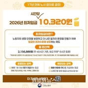 (원투원뉴스) 17년 만에 노사 합의로 결정! 2026년 시간당 최저임금 10,320원 ■ 최저임금이란? 노동자의 생활 안정을 보장하고 더 나은 일자리 환경을 만들기 위해 임금의 최저수준을 보장하는 제도 ■ 월 환산액 2,156,880원(주 40시간 기준, 유급 주휴* 8시간 포함) *주휴수당: 근로자(1주 소정근로시간 15시간 이상)가 1주일 개근한 경우, 주 1회 유급휴일에 대해 지급되는 수당 ■ 포함되는 금액 - 매월 1회 이상 정기 지급하는 임금(매월 지급 상여금, 식비, 숙박비, 교통비 등) ■ 제외되는 금액 - 통화 이외의 것으로 지급하는 임금 - 소정근로 외의 임금(시간외수당 등)