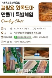 (원투원뉴스) 거제목재문화체험장은 오는 3월 7일과 3월 21일, 성인 방문객을 대상으로 한 원데이클래스 프로그램 『캠핑용 원목도마 만들기 특별체험』을 운영한다고 밝혔다. 실생활 중심의 이번 특별체험은 원목을 활용한 목공 체험을 통해 참가자들이 직접 캠핑 및 일상에서 활용 가능한 원목 도마를 제작해 보는 프로그램으로, 실용성과 감성을 동시에 만족시키는 것이 특징이다. 체험은 거제목재문화체험장 2층 해송공방에서 진행되며, 거제목재문화체험장 네이버 예약프그램으로 사전예약 신청을 한 방문객에 한해 참여할 수 있다. 프로그램은 1일 1회(13시부터 15시까지) 운영되며, 1인 1개 제작, 1일 최대 20명까지 참여 가능하다. 체험 재료비는 35,000원이다. 특히 이번 프로그램은 지역 공방과의 연계를 통해 공급받은 원목 도마재를 활용함으로써, 지역 장인 문화 홍보와 지역경제 활성화에도 기여할 것으로 기대된다. 최경호 산림과장은“캠핑과 생활소품 제작에 관심 있는 성인 방문객들에게 힐링과 취미를 동시에 제공하는 체험 프로그램”이라며, “실생활에서 활용 가능한 목공 작품 제작을 통해 체