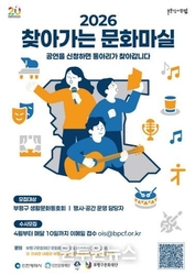 (원투원뉴스) 부평구문화재단은 다음달부터 매월 10일까지 ‘2026 찾아가는 문화마실’ 사업에 참여할 생활문화동호회와 공연 초청 기관·단체를 수시 모집한다. ‘찾아가는 문화마실’은 생활문화동호회가 직접 공연을 기획하고 지역 행사와 연계해 추진하는 생활문화 활동 지원사업이다. 재단은 이 사업을 통해 동호회와 공연 초청 기관․단체를 짝지어 주고, 공연을 지원한다. 선정된 생활문화동호회에는 최대 50만 원의 공연 보상금이 차등 지급된다. 공연 초청 기관·단체에는 최대 20만 원의 포스터 디자인 제작비와 행사 규모에 따른 장비 임차비 일부 지원 등이 제공된다. 재단 관계자는 “재단 출범 20주년을 맞아 주민 주도의 생활문화 기반을 더욱 강화해 나가겠다”며 “이번 사업을 통해 동호회 공연이 지역 행사와 일상 공간에 자연스럽게 자리 잡길 기대한다. 동호회와 지역 행사 관계자들의 많은 관심과 적극적인 참여를 바란다”고 밝혔다. 신청은 전자우편으로 접수하며, 자세한 사항은 문화재단 누리집을 확인하거나 전화로 문의하면 된다.