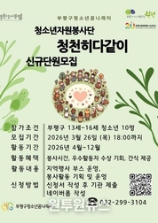 (원투원뉴스) 부평구청소년꿈나래터는 오는 26일까지 2026년도 청소년자원봉사단 ‘청천히 다같이’ 단원을 신규 모집한다고 밝혔다. 청소년자원봉사단은 부평구에 거주하거나 재학 중인 13~16세 청소년을 대상으로 운영되는 자치조직이다. 봉사단은 지역 사회 내 다양한 봉사활동을 직접 기획․운영하게 된다. 이번 모집을 통해 선발된 단원들은 4월부터 12월까지 활동하며 ▲봉사시간 인정 ▲우수활동자 수상 기회 등의 혜택을 받는다. 또한 ▲지역행사 부스 운영 ▲봉사활동 기획 및 운영 등 다양한 활동에 참여할 수 있다. 배재석 부평구청소년꿈나래터 센터장은 “청소년들이 주체적인 자원봉사활동을 통해 지역사회에 대한 관심을 높이고 함께 성장하는 계기가 되길 바란다”고 말했다. 청소년자원봉사단 모집 관련 사항은 전화로 문의하거나, 부평구청소년꿈나래터 누리집 및 카카오톡 채널에서 확인할 수 있다.