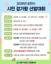 (원투원뉴스) 순천시는 시민들의 일상 속 걷기 실천을 유도하고 건강생활 습관 형성을 위해 ‘2026년 시민 걷기왕 선발대회’를 운영한다고 밝혔다. 이번 걷기왕 선발대회는 사전·사후 인바디 검사를 포함해 3월 23일부터 10월 28일까지 약 8개월간 진행되며, 스마트폰 걷기 앱 ‘워크온’ 순천시 커뮤니티 가입 시민을 대상으로 참여 신청을 받는다. 참여를 희망하는 시민은 오는 4월 3일까지 순천시보건소 2층 운동영양실을 방문해 사전 인바디 검사를 받은 후 워크온 가입을 확인하면 된다. 참가자(사전 인바디 검사자)는 4월 6일부터 9월 30일까지 6개월 동안 120만 보 이상 걷기에 도전하게 되며, 매월 10일 이상 걸어야 하고 하루 1만보까지만 인정된다. 또한 보건소 운동처방사와 영양사가 사전 인바디 검사 결과를 바탕으로 맞춤형 운동 지도와 영양 상담을 제공해 건강한 생활습관 형성을 지원할 예정이다. 챌린지 종료 후 사전·사후 인바디 검사 결과를 비교하여 120만보 이상 걷고 체지방량 3kg 이상 감량한 시민을 우선으로 ‘시민 걷기왕’ 100명을 선정하며, 선정된 시민에게는 순천사랑상품권