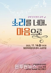 (원투원뉴스) 밀양문화관광재단은 오는 14일과 15일 밀양아리랑아트센터에서 깊어가는 가을을 맞아 시민들에게 따뜻한 감동과 울림을 전할 두 편의 특별한 공연을 선보인다고 6일 밝혔다. 첫 번째 공연은 오는 14일 오후 7시 30분 소공연장에서 열리는 장애 인식개선 공연 ‘소리를 너머, 마음으로’이다. 이 공연은 세계 유일의 시각장애인 전문예술단체인 ‘한빛예술단’과 2024 밀양 꿈꾸는 예술터 교육사업의 일환으로 기획된 발달장애인 합창단 ‘이루다 합창단’, 그리고 2016년 밀양 4개 학교의 발달장애 학생들로 창단된 오카리나 연주팀 ‘오리코러스’가 함께 무대에 올라 따뜻한 감동을 선사할 예정이다. 두 번째 공연은 15일 오후 5시 대공연장에서 열리는 ‘시그널: 시간의 바람’으로, 국립무형유산원과 공동 기획해 마련됐다. 이 작품은 전통과 현대를 잇는 무형유산의 본질과 계승의 의미를 연희·무용·영상 등 다양한 예술 형식으로 풀어내며, 시간의 흐름 속에서도 변하지 않는 전통의 가치를 현대적으로 표현한다. 연출을 맡은 임영호 연출가는 2016년 프랑스에서 만난 밀양백중놀이 고(故) 박동영 선생과의