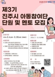 (원투원뉴스) ‘유니세프 아동친화도시’ 진주시는 아동의 권리 증진과 정책 참여의 확대를 위해 6일부터 ‘제3기 진주시 아동참여단’과 이를 지원할 대학생 멘토를 함께 모집한다. 아동참여단은 총 50명 이내로 구성하며, 참여단의 활동 지원과 멘토링을 위해 대학생 멘토단을 10명 이내로 모집할 예정이다. 아동참여단 모집 대상은 8세부터 18세까지의 아동으로, 진주시에 거주하거나 관내 학교에 재학 중인 아동이면 누구나 신청할 수 있다. 또한 대학생 멘토는 아동 권리와 아동정책에 관심이 있는 관내 거주 또는 진주시에 소재한 대학교에 재학 중인 대학생이면 전공과 관계없이 지원할 수 있다. 아동참여단은 아동의 권리 증진과 정책 참여를 목표로 하는 진주시의 대표적인 아동 참여 기구로, 2026년 3월부터 12월까지 ▲아동정책 제안 활동 ▲아동권리 교육 및 아동권리 캠페인 활동 참여 ▲아동관련 행사 참여 등 다양한 활동을 하게 된다. 접수 기간은 6일부터 오는 20일까지이며, 진주시청 누리집 고시공고의 서식을 내려받아 이메일 또는 우편으로 신청하면 된다. 자세한 사항은 진주시청 아동보육과로