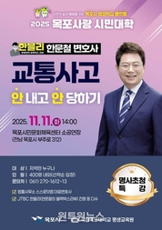 (원투원뉴스) 목포시는 오는 11월 11일 오후 2시 목포시민문화체육센터에서 한문철 변호사를 초청해 ‘교통사고 안 내고 안 당하기’를 주제로 특강을 연다. 이번 강연은 목포시와 국립목포대학교가 공동 운영하는 '목포사랑 시민대학' 강좌의 일환으로 마련됐다. JTBC ‘한블리(한문철의 블랙박스 리뷰)’로 잘 알려진 한문철 변호사는 교통사고 처리 분야의 대표적인 전문가로, 실제 사고 영상과 판례를 통해 법적 책임 비율, 사고 대처 요령 등 일상에서 도움이 되는 교통법률 정보를 알기 쉽게 전할 예정이다. '목포사랑 시민대학'은 ‘글로컬대학30’과 연계한 관‧학 협력 평생학습 사업으로, 목포시와 국립목포대학교가 함께 추진하고 있다. 상반기 1기 과정에서는 8개 강좌에 145명이 수료했으며, 현재 하반기 2기 과정에는 15개 강좌에 250여 명이 참여하고 있다. 시는 시민의 삶과 배움을 잇는 평생학습 플랫폼으로 발전시켜 나갈 계획이다. 시 관계자는 “이번 강연이 시민들의 교통안전 의식을 높이는 계기가 되길 바라며, 앞으로도 목포사랑 시민대학을 통해 보다 다양하고 유익한 평생교육 프로그