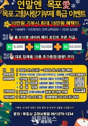 (원투원뉴스) 목포시는 본격적인 연말정산 준비 시기를 맞아 올해 마지막으로 ‘연말엔 목포愛~ 고향사랑기부제 특급 이벤트’를 진행한다고 밝혔다. 이번 이벤트는 고향사랑기부제를 통해 목포시에 10만 원 이상 기부하고 답례품을 신청한 기부자를 대상으로 하며, 별도의 응모 절차 없이 자동으로 참여된다. 이벤트는 11월 5일부터 12월 21일까지 진행되며, 총 810명에게 경품이 제공된다. 먼저 선착순 700명에게는 네이버페이 포인트 쿠폰 5천 원 권이 지급되고, 이후 추첨을 통해 100명에게는 1만 원 권, 10명에게는 5만 원 권을 추가로 증정한다. 다만, 보다 많은 기부자에게 혜택을 제공하기 위해 경품은 중복 지급되지 않으며, 당첨 시 최상위 경품만 지급된다. 예를 들어, 선착순 700명 안에 들면서 동시에 추첨을 통해 5만 원 권에 당첨된 경우, 5만 원 권만 지급되고 선착순 명단에서는 제외된다. 이번 경품으로 제공되는 네이버페이 포인트 쿠폰은 간편하고 즉시 사용 가능한 디지털 경품으로, 기부자들이 실질적인 혜택을 체감할 수 있도록 마련됐다. 10만 원 기부 시