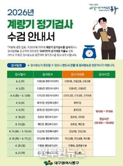 (원투원뉴스) 대구 동구청은 오는 4월2일부터 21일까지 ‘2026년 계량기 정기검사’를 실시한다. 검사 대상은 관내 정육점, 대형마트, 전통시장 등에서 사용되는 상거래용 10톤 미만의 저울이다. 또, 검사와 함께 계량기 수리 전문 기술자가 검사 현장에 함께해 단순한 오차 등 경미한 결함이 발견된 계량기는 현장에서 즉시 수리한다. 김태운 동구청장 권한대행은 “이번 정기검사를 통해 계량의 신뢰성을 철저히 확보하겠다”고 말했다.