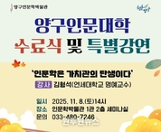 (원투원뉴스) 양구군은 8일 양구인문학박물관 세미나실에서 인문대학 수료식 및 특별강연을 진행한다. 양구 인문대학은 올해 4월부터 11월까지 매월 1회 ‘조화와 균형의 인문학’을 주제로 운영됐다. 인문학 전문 강의를 통해 군민의 인문학적 소양을 함양하고, 양구군을 인문학 중심도시로 육성하기 위한 기반을 마련하고자 추진됐다. 올해 인문대학에는 총 53명이 접수해 이 중 25명이 수료한다. 수료식에서는 전체 강의의 80% 이상을 이수한 수강생에게 양구군수와 김형석 명예교수 명의의 수료증이 수여된다 수료식 이후에는 김형석 명예교수가 ‘인문학은 가치관의 탄생이다’를 주제로 특별강연을 진행한다. 강연에서는 급변하는 현대사회 속에서 개인의 사유, 가치 판단, 삶의 태도 형성에 있어 인문학이 갖는 의미를 되짚어볼 예정이다. 진행된 강좌 △고미술과 현대미술의 균형적 이해 △소통을 위한 공감 독서법 △진심을 담은 옛 사람들의 소통법 △기계와 짐승 사이에서 △덜 소비하고 더 나누는 삶 △어머니의 밥상을 찾아서: ‘귀향’ 등에서 다양한 인문학적 관점을 다뤄 수강생들의 높은 호응을 받았다. 임경빈 인문학박물관