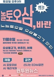 (원투원뉴스) 동해시가 오는 11월 8일 오후 3시부터 7시까지 갤러리바란 인근 공영주차장에서 발한지구 도시재생사업의 일환으로 지역 상권재생을 위한 특별 행사 “놀토오삼, 바란 앵콜!”을 개최한다고 밝혔다. 동해시는 지난 6월 두 차례에 걸쳐 추진된 발한지구 도시재생사업 축제를 성공적으로 마무리한 이후, 행사 참가자들의 요청으로 앵콜 행사를 준비했다. 이번 행사에서는 동해 묵호항의 대표 먹거리 ‘오삼불고기’를 중심으로 AI 기술 체험존, EDM 공연 등 다양한 프로그램이 마련된다. 행사이름인‘놀토오삼 바란’은‘노는 토요일, 오삼불고기 파티’의 뜻으로, 축제 현장에서는 주민협의체에서 준비한 ‘오삼불고기’와 다양한 로컬 먹거리를 만나볼 수 있다. AI 기술을 활용한 체험존도 주목할 만하다. 행사현장을 방문한 시민들은 가족 및 지인들과의 사진을 AI 기술로 재구성해 영상으로 제작하거나, 본인의 얼굴을 AI 캐리커처로 제작하는 특별한 체험을 할 수 있다. 동해시는 이를 통해 시민들의 참여도와 만족도를 높이고, 입소문을 통한 관광 홍보 효과를 기대하고 있다. 또한, 동쪽바다 중앙시장을 비롯한 지