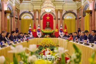 (원투원뉴스) 베트남을 국빈 방문한 이재명 대통령은 22일(현지시간) "양국은 2030년까지 교역 규모 1500억 불 목표 달성을 위해 교역·투자 협력을 더욱 호혜적으로 발전시켜 나가기로 했다"고 밝혔다. 이 대통령은 이날 또 럼 베트남 서기장 겸 국가주석과 하노이에 위치한 주석궁에서 정상회담 후 가진 공동언론발표를 통해 이 같이 말했다. 이 대통령은 발표를 통해 "베트남은 대한민국의 3위 교역·투자국이고, 한국은 베트남의 최대 투자국"라며 "약 1만 개의 한국 기업이 석유화학, 조선, 철강, 전자를 아우르는 전 분야에 진출해 높은 수준의 경제 연대를 이루고 있다"고 협력 관계를 강조했다. 또 "한국은 베트남의 '2045년 고소득 선진국 진입' 비전 실현을 위한 최적의 파트너로서, 물류, 교통, 에너지, 인프라와 같은 하드웨어 분야에서부터 과학기술, 지적재산, 창조산업 등 미래 산업 분야까지 전방위적인 협력을 추진하고 있다"고 덧붙였다. 이 대통령은 "이번 정상회담에서 '포괄적 전략 동반자' 협력을 더욱 공고히 하기로 했다"며 회담 주요 성과를 소개했다. 교역·투자 협력 관련