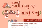 (원투원뉴스) 인천광역시교육청주안도서관은 학부모의 인문학적 소양을 함양하고 가정 내 독서문화를 확산하기 위하여, 오는 23일부터 학부모 독서동아리 ‘글쓰담’ 회원을 모집한다. 이번 프로그램에 참여하는 학부모들은 ‘AI가 쓰지 못하는 문장’이라는 주제로 그림책과 동시를 읽고 자신의 삶과 연계해 글과 그림으로 표현하는 시간을 갖는다. 프로그램 운영 기간은 4월 13일부터 6월 8일까지이며, 주안도서관 누리집에서 3월 23일 오전 10시부터 선착순으로 모집한다. 자세한 내용은 도서관 누리집을 확인하거나 어린이자료실로 문의하면 된다.