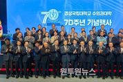 (원투원뉴스) 경상국립대학교 수의과대학은 설립 70주년을 맞이하여 70년 개척의 역사를 바탕으로 미래 100년을 향한 새로운 비상을 기념하기 위해, 10월 23일 오후 5시 칠암캠퍼스 100주년 기념관에서 ‘70년 개척의 자부심, 100년을 향한 새로운 비상’이라는 슬로건으로 ‘경상국립대학교 수의과대학 70주년 기념행사’를 개최했다. 기념행사에는 경상국립대학교 권진회 총장, 권순기 전 총장, 김상현 수의과대학장과 명예교수, 교직원, 학생, 최재영 수의과대학 총동문회장과 동문회 임원, 대한수의사회 허주형 회장, 이영락 부산수의사회 회장, 엄상권 경남수의사회 회장 등 300여 명이 참석했다. 기념행사는 개식, 국민의례, 내빈 소개, 대학 발전사 영상 시청, 환영사, 학사보고, 기념사, 축사, 공로패 수여, 감사패 수여, 발전기금 전달식, 학생 축하공연, 교가 제창, 기념 촬영 등의 순으로 진행됐다. 이날 행사에서 수의과대학 발전에 기여한 수의과대학 김종섭 명예교수, 최상용 명예교수, ㈜코미팜 문성철 대표, 대한수의사회 허주형 회장, 부산수의사회 이영락 회장에게 공로패를 수여했다. 또한 서울대학교 양일석