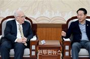(원투원뉴스) 유정복 인천시장은 12월 3일 오후 인천시청 접견실에서 세계 최고 수준의 의과·바이오 연구 중심 대학인 존스홉킨스대의 조나단 슈넥(Jonathan schneck) 의과대학 교수(왼쪽) 일행을 접견했다. 이번 접견은 12월 4일 인천에서 ‘존스홉킨스대 글로벌 바이오 혁신 서밋’을 개최하게 됨에 따라, 이번 서밋을 주관한 존스홉킨스대학의 교수진과 다양한 협력 방안을 논의하기 위해 마련됐다. 유정복 인천광역시장(가운데), 조나단 슈넥 교수(왼쪽에서 세 번째), 김덕호 존스홉킨스 글로벌 생명공학 혁신 센터장(왼쪽에서 두 번째)는 ▲향후 인천을 거점으로 한 한-미 공동연구 및 바이오 혁신기술 산업화 방안 ▲존스홉킨스대 연구센터(R·D센터) 유치 등에 대한 논의를 이어갈 방침이다. 조나단 슈넥 존스홉킨스대 교수는 “송도를 중심으로 한·미 바이오 협력이 새로운 글로벌 혁신 모델로 정착하길 기대한다”라고 말했다. 유정복 인천시장은 “인천시는 세계적 연구기관과 글로벌 기업, 산업 협회와의 협력을 통해 연구개발부터 산업화, 글로벌 진출까지 연결되는 바이오 산업 생태계 조성을 적극 지원하겠다”라고 밝혔다