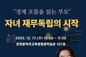 (원투원뉴스) 인천광역시교육청평생학습관은 17일 고3 학부모를 대상으로 부모쉼표 특강 ‘경제 흐름을 읽는 부모: 자녀 재무독립의 시작’을 운영한다. 이번 특강은 자녀의 사회진입을 앞둔 학부모가 변화하는 경제 환경을 이해하고, 준비된 시각에서 자녀의 재무독립을 지원하도록 돕는 프로그램이다. 강의는 전 증권사 애널리스트이자 경제·투자 리서치사 ‘광수네 복덕방’의 이광수 대표가 맡아 부모 역할, 경제 변화의 기본 이해, 가정에서 실천 가능한 경제 소통 방법 등을 안내한다. 참여 대상은 인천 관내 고3 및 관심 있는 학부모 100명이며, 신청은 12월 3일 오전 10시부터 평생학습관 누리집에서 선착순으로 받는다. 자세한 사항은 평생학습관 누리집 공지사항 또는 평생교육부로 문의하면 된다.