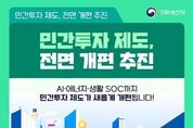 (원투원뉴스) AI·에너지·생활 SOC까지 민간투자 제도가 새롭게 개편됩니다! 1. 민간투자 제도란? 사회 기반 시설에 대한 민간의 투자를 촉진하여 창의적·효율적으로 사회기반시설을 확충·운영하는 제도 제도 도입 이후 30년 동안 총 872개 사업, 약 154조 원 규모의 민자사업 추진 → AI 등 신산업 분야, 노후시설 성능 개선 등 급증하는 투자 수요에 대응하기 위해서는 재정과 민간투자의 병행이 필수! 2. 이렇게 달라집니다. - 신사업·신유형 확대 - 국민 참여 확대 및 국민 생활 편익 증진 - 지방의 민자 활성화 및 민자사업의 안전 강화 - 절차 단축 등 사업 추진 여건 개선 4대 분야 20개 과제 마련으로 '민간투자의 패러다임 전환' 3. ① 신사업·신유형 확대 AI 데이터센터, 전력망, 철도 복합 시설 등 신산업·신유형 분야에 민간투자 활용 전통적 SOC(도로·철도 등)에서 벗어나 신산업 분야에도 민자 방식을 도입하고, 단순 운영형 민자 신설, 대상지 공모 방식 개선 등으로 신유형 사업 방식을 활성화합니다. ② 국민 참여 확대 및 편익 증진 일반 국민이 위험 부담