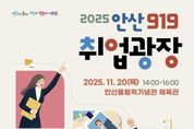 (원투원뉴스) 안산시는 오는 20일 ‘2025년 11월 안산 919취업광장’을 안산올림픽기념관 체육관에서 개최한다고 5일 밝혔다. 이번 ‘안산 919취업광장’은 안산시일자리센터와 지역 일자리 유관기관이 협업해 진행하는 올해의 마지막 채용행사다. 시는 인력난을 겪고 있는 기업체에 우수 인력을 지원하고 취업을 희망하는 구직자에게는 일자리 기회를 제공하는 등 미스매칭 해소를 통한 만남의 장을 마련한다. 이날은 우수기업체 30여 개 사가 참여할 예정이다. 한편, 안산시는 지난 9월 경기도와 공동으로 ‘안산시 스마트허브 2040·경기도 5070 통합 일자리박람회’를 개최해 40개 기업 면접에 1,300여 명이 참여한 바 있다. 참가를 원하는 구직자는 박람회 당일 이력서 등 입사 지원 서류를 지참해 방문하면 ▲1:1 채용면접 ▲1:1 이력서 컨설팅 등 현장에서 희망하는 기업에 지원하고 면접에 참여할 수 있다. 일자리 기관별 취업 상담 및 재무 상담도 받을 수 있다. 참여 기업 정보와 박람회 일정 등 자세한 내용은 안산시청 누리집 ‘안산시 주요서비스-취업(일자리)정보’에서 확인하거나, 안산시일자리센