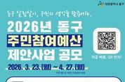 (원투원뉴스) 대전 동구는 2026년 주민참여예산 제안사업을 본격 추진하며, 내달 27일까지 공모 접수를 실시한다고 24일 밝혔다. ‘주민참여예산제’는 주민이 사업 발굴부터 심사, 선정까지 예산 편성 전 과정에 직접 참여해 지역에 필요한 사업을 제안하는 제도다. 이번 공모는 총 1억 원 규모로 추진되며, 사업별 2천만 원 한도 내에서 행정동 단위 ‘주민 생활밀착형 소규모 단년도 사업’을 대상으로 한다. 참여 대상은 동구 주민을 비롯해 지역 내 직장인과 학생, 비영리단체 회원 등 누구나 가능하며, 동 행정복지센터 방문 또는 주민참여예산제 전용 온라인 플랫폼(동구 홈페이지 ' 구민참여 ' 주민참여예산제)을 통해 신청할 수 있다. 접수된 제안사업은 사업 추진부서의 적격성 검토와 동 지역회의 심사를 거쳐, 온라인 구민투표 및 동구 주민참여예산위원회 심의를 통해 최종 선정된다. 선정된 사업은 2027년도 본예산에 반영돼 추진될 예정이다. 박희조 동구청장은 “주민의 시선에서 발굴된 사업이 지역에 실질적인 변화를 만들어내는 출발점이 될 것”이라며 “생활 속에서 체감할 수 있는 다양한 아
