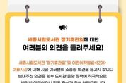 (원투원뉴스) 세종시립도서관이 도서관 운영 방향에 대한 시민의 목소리를 듣기 위해 오는 22일까지 시민 의견 조사를 진행한다. 이번 설문의 주요 내용은 도서관 이용 편의와 직결되는 정기휴관일 운영일과 어린이 작업실 ‘모야’ 이용 시간이다. 의견 조사는 세종시립도서관 누리집을 통한 온라인 설문과 도서관 내 비치된 설문지 작성을 통해 누구나 참여할 수 있다. 제출된 의견은 도서관 운영 정책 수립 및 서비스 개선을 위한 기초 자료로 활용될 예정이다. 세종시립도서관 관계자는 “이번 조사는 시민의 눈높이에서 도서관 운영을 점검하는 과정”이라며 “조사 결과를 바탕으로 이용자 편의와 도서관 운영 효율화 방안을 종합적으로 검토해 나갈 계획”이라고 말했다.
