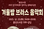 (원투원뉴스) 김포시 통진도서관은 오는 12월 23일 저녁 7시부터 8시까지 다가오는 연말을 기념하여 온 가족이 함께 즐길 수 있는 브라스 음악공연을 운영한다. 이번 공연은 경기아트센터에서 지원하는 ‘찾아가는 문화복지공연’ 사업으로, 김포시 북부권 시민들을 대상으로 일상 가까이에서 문화예술을 만나는 기회를 제공하고, 지역 간 문화 격차를 완화하고자 기획했다. 이번 공연은 금관 5중주로 구성된 앙상블 코리안아츠의 풍성한 선율로 채워질 예정이며, 코리안아츠는 대한민국 국제관악제 홍보대사와 2018년 평창동계올림픽 개막식 《승리의 팡파레》를 연주하는 등 화려한 이력을 지닌 팀으로, 클래식은 물론 영화와 대중음악 등 다양한 장르를 넘나들며 새로운 음악적 시도를 이어가고 있다. 도서관 관계자는 “이번 공연은 영화 및 애니메이션 음악공연으로 누구나 쉽게 즐길 수 있으며, 이번 공연을 통해 온 가족이 따듯한 연말을 보내길 바란다”라고 말했다.