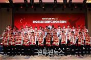 (원투원뉴스) K리그2 진출을 앞둔 김해FC2008이 올 시즌 선전을 다짐하는 출정식을 성황리에 진행하며, 역사적인 첫 걸음을 이루었다. 22일 롯데호텔앤리조트 김해에서 열린 이번 출정식은 구단주인 홍태용 김해시장과 지역 정치계 인사, 한웅수 프로축구연맹 부총재를 비롯한 축구계 인사, 스포츠트라이브 황효진 대표이사 등 후원사 관계자, 서포터즈 구신과 축구팬 등 약 400여명이 참석한 가운데 김해FC의 도전을 한마음 한 뜻으로 함께 응원하고 축하하는 자리로 마무리 됐다. 관내 청소년 댄스팀의 축하공연으로 막을 올린 출정식에서는 참석한 내외빈의 축사, 손현준 감독의 출정사와 주장단의 결의문 낭독, 선수단 소개를 비롯해, 지난달 리뉴얼한 새 엠블럼을 화려한 비쥬얼의 3D 영상으로 구현하여 공개했고, 2026시즌 공식 유니폼 킷 4종을 선수들이 실제 착용하고 나와 팬들의 뜨거운 호응을 불러일으켰다. 또한 지난 K3리그 우승 상금으로 관내 유소년 축구팀과 아동시설에 후원 물품을 전달하는 등 훈훈한 사회공헌 활동도 함께 진행됐다. 행사 후반부에서는 팬들의 질문에 선수들이 직접 대답하는 Q·A 코너를 비롯해,