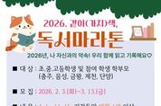 (원투원뉴스) 충청북도교육청 직속기관 중원교육문화원은 언제나 책봄 정책을 활성화 하기 위해 2월 3일부터 3월 13일까지 북부권 초‧중‧고등학생과 학부모를 대상으로 '2026년 같이(가치)책 독서마라톤' 참여자를 모집한다. 중원교육문화원은 3월 말 발대식을 시작으로 오는 12월까지 독서마라톤을 본격 운영할 계획이다. '2026년 같이(가치)책 독서마라톤'은 학생들이 매월 읽기와 기록, 성찰 활동을 반복하며 꾸준한 독서 습관을 기를 수 있도록 운영되는 프로그램이다. 참가자들은 다채움 플랫폼 ‘채움책방’을 활용해 시간과 장소에 관계없이 독서 활동에 참여할 수 있으며, 누적 독서량에 따라 12월에 구간별 완주증서와 기념품을 받게 된다. 참여 기준은 매월 1편 이상, 총 8회의 독후감상문을 업로드하는 것으로, 학년별 독후감상문 서식과 글자 수 기준에 따라 독서 권수가 인정된다. 독서 완주구간은 ▲소크라테스(8~16권) ▲플라톤(17~34권) ▲아리스토텔레스(35권 이상)으로 구분된다. 참여를 희망하는 학생은 중원교육문화원 누리집에서 신청할 수 있으며, 기타 문의 사항은 독서진흥과로