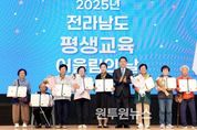 (원투원뉴스) 전라남도는 17일 화순 하니움문화스포츠센터에서 ‘2025 전라남도 평생교육 어울림의 날’ 행사를 열고, 평생교육에 참여한 학습자들의 성취를 격려하며 평생학습 문화를 확산하는 뜻깊은 자리를 가졌다고 밝혔다. 이날 행사에는 김영록 전남도지사, 황성환 전남도교육청 부교육감, 구복규 화순군수, 류기준·임지락·오미화 전남도의원 등 주요 내빈을 비롯해 평생교육 학습자, 문해교육 시화전 수상자, 도민 등 700여 명이 참석했다. 행사는 ‘배움의 성취를 함께 나누는 평생학습의 장’으로 평생교육 학습자 간 교류와 화합을 통해 평생학습의 가치를 공유하기 위해 마련됐다. 개회식에서는 ‘평생학습으로 열어가는 전남 인재육성의 길’이라는 영상을 통해 전남인재육성 정책을 소개하고, 도지사상·도의장상·교육감상 등 평생교육과 문해교육 분야에서 우수한 성과를 거둔 총 30명에 대한 시상식이 진행됐다. 이어 평생학습자들은 ‘평생학습으로 밝히는 전남의 미래’를 주제로 희망의 불빛을 함께 밝히는 퍼포먼스를 펼치며, 평생교육을 통해 도민 모두가 함께 성장하는 전남을 만들어가겠다는 의지를 다졌다. 평생교육프로그램