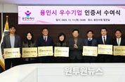 (원투원뉴스) 용인특례시는 11일 시청 접견실에서 ‘2025년 용인시 우수기업 인증제’ 심의 결과 선정된 ‘올해의 우수기업’ 10개 사에 인증서를 전달했다. 이상일 용인특례시장은 이들 기업 대표와 임직원들을 만나 축하와 격려 인사를 나누고 우수기업 인증서와 현판을 전달했다. 이상일 시장은 “우리 경제가 어려운 가운데서도 기업 활동을 잘 해주셔서 우수기업으로 선정된 것을 축하드린다”며 “각자 분야에서 그동안 많은 노하우를 쌓아왔기에 경제가 어려운 가운데서도 성과를 냈고, 우리 지역 경제에도 큰 보탬이 돼 주셔서 감사드린다”고 말했다. 이 시장은 “기업 활동으로 한 가족의 가장은 힘을 얻어 가정을 잘 꾸려갈 수 있고, 신규 일자리를 찾는 사람에게는 희망을 주셨다”며 “기업인들이 활동하실 수 있도록 환경을 잘 개선해 나갈 것”이라고 했다. 시는 매년 경영 실적, 기술·품질 경쟁력, 지역사회 기여도 등 다양한 지표를 종합 평가해 지역경제 발전에 기여한 중소기업을 우수기업으로 인증하고 있다. 올해 선정된 기업은 ▲㈜대성티엠씨 ▲신명이엔씨㈜ ▲주식회사 에이드로 ▲㈜에이치에스씨엠티 ▲주식회사 에코윈