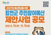(원투원뉴스) 합천군은 2027년도 예산편성을 위한 주민참여예산 제안사업 공모를 6월 16일까지 실시하며, 올해부터 공모 분야를 기존 1개 모델 3개 유형에서 3개 모델 5개 유형으로 확대 개편한다고 밝혔다. 기존 공모사업이 시설 확충 등 ‘장소형 사업’에 편중되어 다양한 계층의 세밀한 요구를 반영하기 어려웠던 점을 개선하기 위해 공모 모델을 전면 재구조화하여, 올해는 총 20억 원 규모로, 기존 장소 중심의 사업에 당사자 맞춤형과 역점사업 주제형을 추가해 장소형, 당사자형, 주제형의 3개 모델로 운영된다. 이번 제안사업 공모는 △ 지역발전 및 생활 인프라 확충을 위한 ‘군정참여형’, ‘생활안전형’, ‘읍면주민주도형’의 '장소형' 3개 유형과, △ 세대 간 소통과 맞춤형 복지를 위한 '당사자형'의 ‘세대공감동행형’ △ 지역의 핵심 미래 전략을 반영한 '주제형'의 ‘관광·체육 특화형’ 총 5개 유형이며, 예산편성 기준에 맞지 않거나, 행사성사업, 특정 개인, 단체만을 지원하는 사업 등은 공모 대상에서 제외된다. 합천군민이면 누구나 공모에 참여 가능하고, 제안서를 작성해 읍·면사무소 또는 군청 기획예산담당관에 방