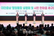 (원투원뉴스) 대전시는 12일 시청 대강당에서 대전광역시의회, 대전충남 행정통합 민관협의체(이하 민관협)와 공동으로 “대전충남 행정통합 설명회 및 시민 한마음 촉구대회”를 개최하고, 대전충남 행정통합 특별법안의 조속한 국회 심의․의결을 촉구했다. 이날 행사는 최근 대통령이 행정통합의 필요성을 공식 언급하면서 통합 논의가 새로운 전기를 맞은 가운데 마련됐으며, 약 600명의 시민이 참석해 추진상황을 공유하고 통합 의지를 결집했다. 이창기 민관협 공동위원장은 지난 10월 2일 특별법안 발의 이후 경과를 소개하며, 통합으로 기대되는 효과를 설명했다. 이 공동위원장은 통합 시 인구 360만 규모의 초광역 혁신 클러스터 형성, 광역교통․생활권 확장 등 실질적인 변화를 강조하며 “행정통합은 수도권 일극체제에 대응할 충청권의 경쟁력 확보 전략”이라고 밝혔다. 설명회 후에는 통합을 촉구하는 퍼포먼스가 진행됐다. 이장우 대전시장, 조원휘 대전시의회의장, 이창기 민관협 공동위원장, 남재동 대전사랑시민협의회장이 관객석에서 행정통합을 촉구하는 구호를 선창하고 시민이 후창하는 카드섹션을 펼쳤으며, 이어 무대에서는 통합 결