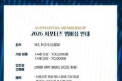 (원투원뉴스) 김천상무 공식 서포터즈 ‘수사불패’가 멤버십 회원을 모집한다. 김천상무 공식 서포터즈 수사불패가 1월 28일부터 시즌 종료 시까지 ‘2026 서포터즈 멤버십’ 회원을 모집한다. 멤버십은 선착순 200명 한정으로 운영되며, 가입비는 14세 이상 10만 원, 14세 미만 7만 원이다. 이번 서포터즈 멤버십은 ‘역대급 혜택’으로 구성됐다. 먼저 멤버십 회원은 김천상무 홈경기 시 선수들과 가장 가까운 곳에서 응원의 열기를 느낄 수 있는 서포터즈석(N2, N3구역) 입장권을 정액 7천 원에 구매할 수 있다. 동시에 가입회원 본인에 한해 서포터즈석 선예매가 가능하다. 다양한 이벤트 혜택도 있다. 서포터즈 특화 행사 참여 기회가 제공되며, 홈경기 서포터즈석 티켓 지원, 원정경기 티켓 일부 지원 혜택도 받을 수 있다. 멤버십 패키지 구성 또한 풍성하다. 서포터즈를 형상화한 멤버십 실물카드와 랜야드가 기본으로 제공되며, 14세 이상 가입자는 구단 공식 의류 후원사 켈미 바람막이를 받을 수 있다. 14세 미만 가입자는 구단 공식