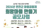 (원투원뉴스) 연천군 마을공동체지원센터가 농어촌기본소득과 연계한 ‘2026년 희망마을 만들기 주민공모사업’ 참여 공동체를 모집한다. ‘희망마을 만들기 공모사업’은 지역의 인적·물적 자원을 활용해 주민 스스로 마을의 문제점을 발굴하고 해결 방안을 모색해 실행할 수 있는 마을 단위의 주민 주도형 공동체 활동 지원사업으로, 총 10개 공동체를 선정해 팀당 최대 200만 원을 지원할 계획이다. 올해 희망마을 만들기 공모사업은 5월 중 1차 서류심사 및 2차 발표심사를 거쳐 6월 최종 선정되며, 기존과는 다르게 이음메이커(공동체지원활동가)를 공동체와 연계해 현장 밀착형 지원을 강화한다. 이음메이커는 사업 추진 과정에서 공동체가 어려움을 겪는 정산 업무와 운영 방향 설정을 함께 고민하고, 실질적인 활동 역량을 높일 수 있도록 맞춤형 지원을 제공할 예정이다. 신청 대상은 농어촌기본소득을 수급하는 5인 이상의 주민 모임이며, 환경·생태, 돌봄·나눔, 마을 경제, 마을 기록 등 다양한 분야의 활동이 가능하다. 특히 단순 행사나 일회성 사업은 제외하고, 지속가능성과 공익성을 갖춘 공동체 활동 중심으로 선