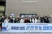 (원투원뉴스) 수원시 영통구 망포1동 행정복지센터는 지난 12월 19일 통장, 공무원 등 40여 명이 참여한‘내 집 앞 눈 쓸기 캠페인’을 실시했다. 이번 캠페인은 주민 스스로 내 집 앞 보행로의 눈을 치우는 생활 속 실천 운동으로, 대설 시 제설 공백을 최소화하고 이웃 간 배려 문화를 확산하기 위해 마련됐다. 강설로 인한 보행자 안전사고를 예방하기 위해 이면도로, 경사지점 등 취약한 지역에 제설함을 배치해 주민 스스로 살포하여 결빙을 방지할 것을 홍보했다. 주택가 골목길과 상가 밀집 지역은 제설차 진입이 어려워 주민 참여가 무엇보다 중요한 만큼, 주민, 상인회에 홍보 전단을 나누어 주며 적극적인 홍보와 참여를 독려했다. 특히 10cm 이상 눈이 내리면 신속한 제설을 위해 망포1동 관내를 7개 구역으로 나누고, 단체원들을 거주지 인근으로 배치해 제설 지침을 마련하여 행정복지센터의 요청 시 담당구역 제설에 참여해 줄 것을 당부했다. 김영희 망포1동장은“내 집 앞 눈 쓸기는 작은 실천이지만, 어르신과 어린이의 안전을 지키는 큰 힘이 된다”며 “주민 여러분의 자발적인 참여를 부탁드린다”고 말했다.