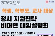 (원투원뉴스) 경북교육청은 15일과 16일 양일간, 2026학년도 정시모집 지원을 대비하기 위해 ‘2026학년도 정시 지원전략 비대면 대입 설명회’를 운영한다고 밝혔다. 이번 설명회는 2026학년도 정시모집을 준비하는 학생과 학부모․교사에게 대학수학능력시험 분석 자료와 수도권·지역거점대학 등의 정시모집 정보를 제공해 지원전략 수립을 돕기 위해 마련됐다. 특히, 진학지도가 필요한 교사뿐 아니라, 실제 지원을 해야 하는 학생과 학부모님들에게도 기회를 제공하여, 불수능의 영향으로 혼란을 겪고 있을 경북 지역 학생과 학부모 모두에게 유익한 정보를 제공할 수 있을 것으로 기대된다. 양일간 진행되는 설명회는, 15일 19시에는 ‘2026학년도 대학수학능력시험 실시 결과와 수도권 15개 대학 정시모집 지원전략’을, 16일 19시에는 ‘수도권 대학, 지역거점국립대 및 지역 대학 정시 지원전략’을 주제로 운영되며, 참가자는 관심 분야에 맞는 설명회를 사전 선택해서 참여할 수 있다. 설명회는 ZOOM을 활용한 온라인 방식으로 진행되며, 참가 신청은 경북진학지원센터 누리집을 통해 가능하다. 김기활 중등교육