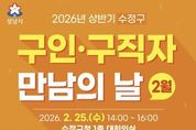 (원투원뉴스) 성남시는 시민의 취업을 지원하고 지역 기업의 인력난 해소를 위해 오는 2월 25일 오후 2시부터 4시까지 수정구청 1층 대회의실에서 ‘구인·구직자 만남의 날’ 행사를 연다. 이번 행사에는 12개 기업이 참여해 다양한 직종을 대상으로 구직자와 1대1 현장 면접을 진행하며, 총 55명을 채용할 예정이다. 참여 기업과 채용 직종은 △㈜현대에쓰앤에쓰(생산) △㈜케어마스터(객실관리, 미화) △노무법인 더보상 법률원(영업) △프리미안데이케어(요양보호사) △하이머시닝㈜(MCT 가공·조작) △㈜아람인테크(조리원) △케이엔자산관리㈜(보안) △공정노무법인(법률사무원 외근) △㈜대원버스(승무사원) △이엠플러스(생산, 자재관리) △파네트리(판매, 생산) △분당센트럴요양병원(조리)이다. 구직자는 이력서 등 구비서류를 지참해 행사 당일 현장을 방문하면 희망 기업의 부스에서 순서에 따라 면접에 참여할 수 있다. 시는 현장 면접과 함께 1대1 취업 컨설팅, 지문 적성 검사, 이력서 사진 무료 촬영 등 다양한 부대행사도 운영해 구직자의 취업 준비를 지원할 계획이다.