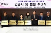 (원투원뉴스) 용인특례시는 3일 본관 4층 전겹실에서 일자리 창출에 힘쓴 지역 우수기업 8곳에 인증서와 현판을 수여했다. 이번에 선정된 기업은 ▲아산디앤씨 주식회사 ▲일승푸드 제2공장 ▲주식회사 에이치에스씨 ▲㈜인실리코젠 ▲주식회사 홈체크 ▲㈜휴먼인텍 ▲케이제이건설산업(주) ▲트루션 등 총 8개사다. 시는 1차 서류심사와 2차 현장실사를 거쳐 일자리 창출 실적, 고용 안정성, 기업의 성장 가능성, 근로환경 등을 종합적으로 평가해 우수기업을 선정했다. 이들 기업은 최근 1년간 총 74명(기업당 4~19명)을 신규 채용해 지역 내 일자리 창출에 기여했다. 또, 다양한 직원복지제도로 근무하기 좋은 환경을 조성해 일자리의 질을 높이는 데 크게 힘쓴 것으로 평가됐다. 이들 기업에는 인증서와 현판이 수여되며, 시가 주최하는 일자리사업, 기업지원사업 참여 시 가점이 주어진다. 일자리박람회 등 채용 행사에도 우선적으로 참여할 수 있다. 용인특례시 일자리창출 우수기업 인증제는 2018년부터 시행되고 있으며, 매년 고용 확대와 일자리 창출에 기여한 기업을 발굴·지원하고 있다. 우